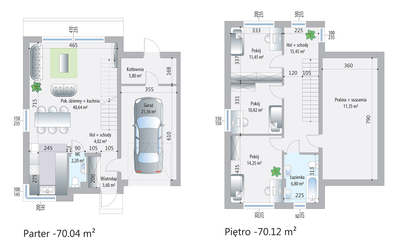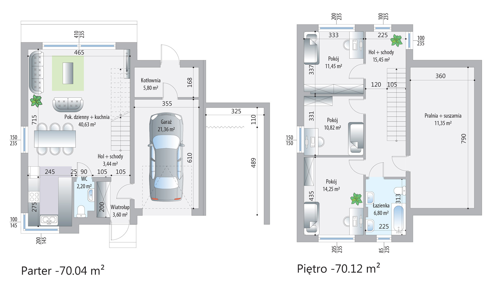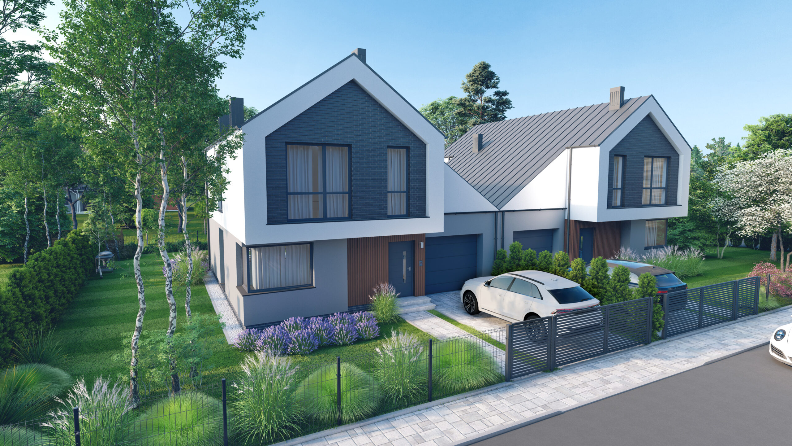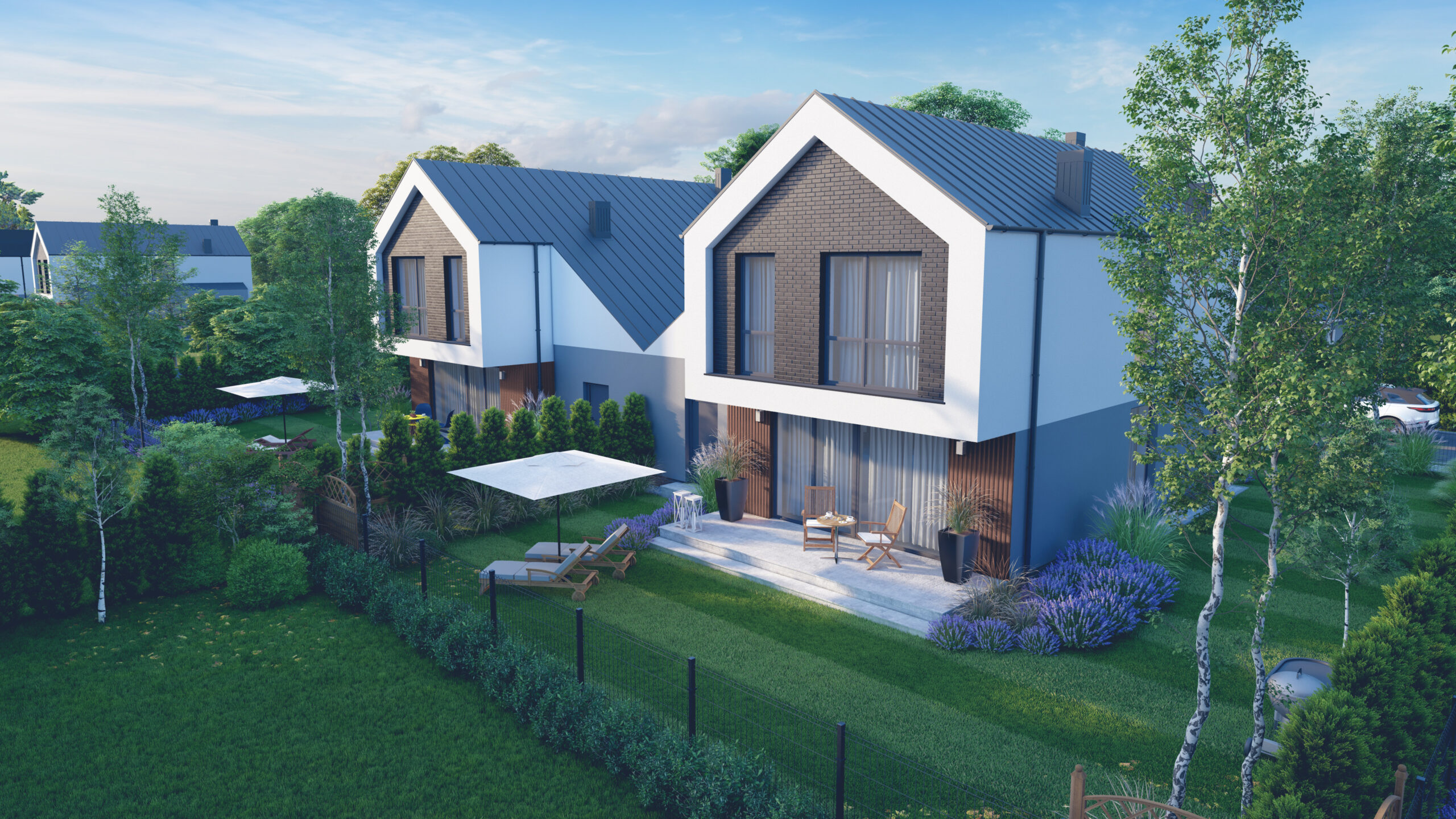 Każdy dom w kompleksie został zaprojektowany z myślą o wysokim standardzie życia mieszkańców. Budynki są wyposażone w nowoczesne technologie, takie jak rekuperacja, która zapewnia świeże powietrze i oszczędność energii, oraz ogrzewanie podłogowe, które gwarantuje komfort cieplny. Panoramiczne okna wpuszczają dużą ilość naturalnego światła, co tworzy przyjemną i jasną atmosferę wewnątrz domów.