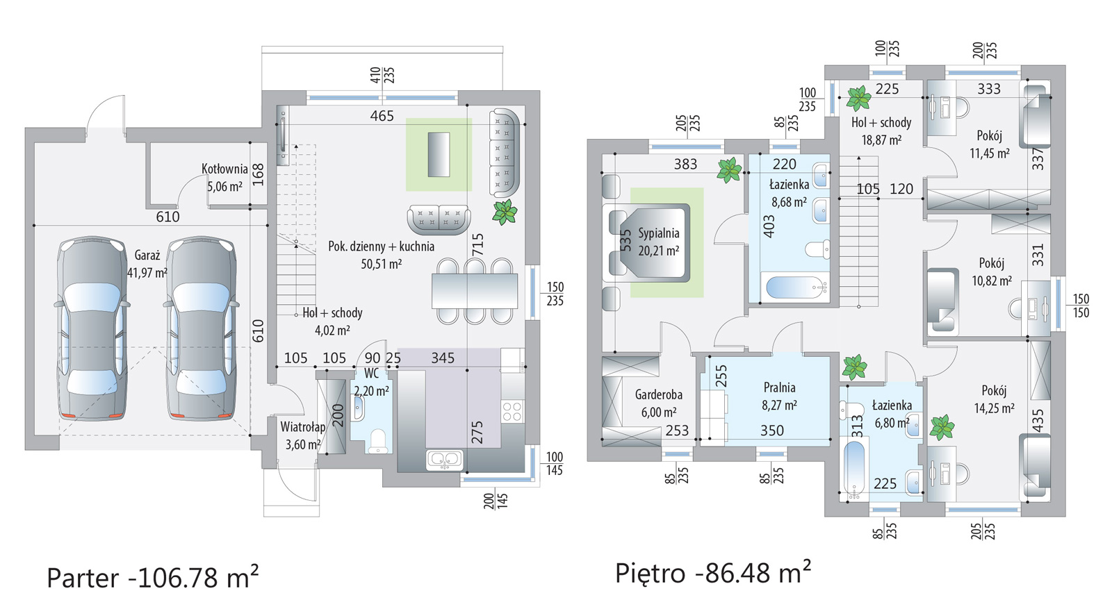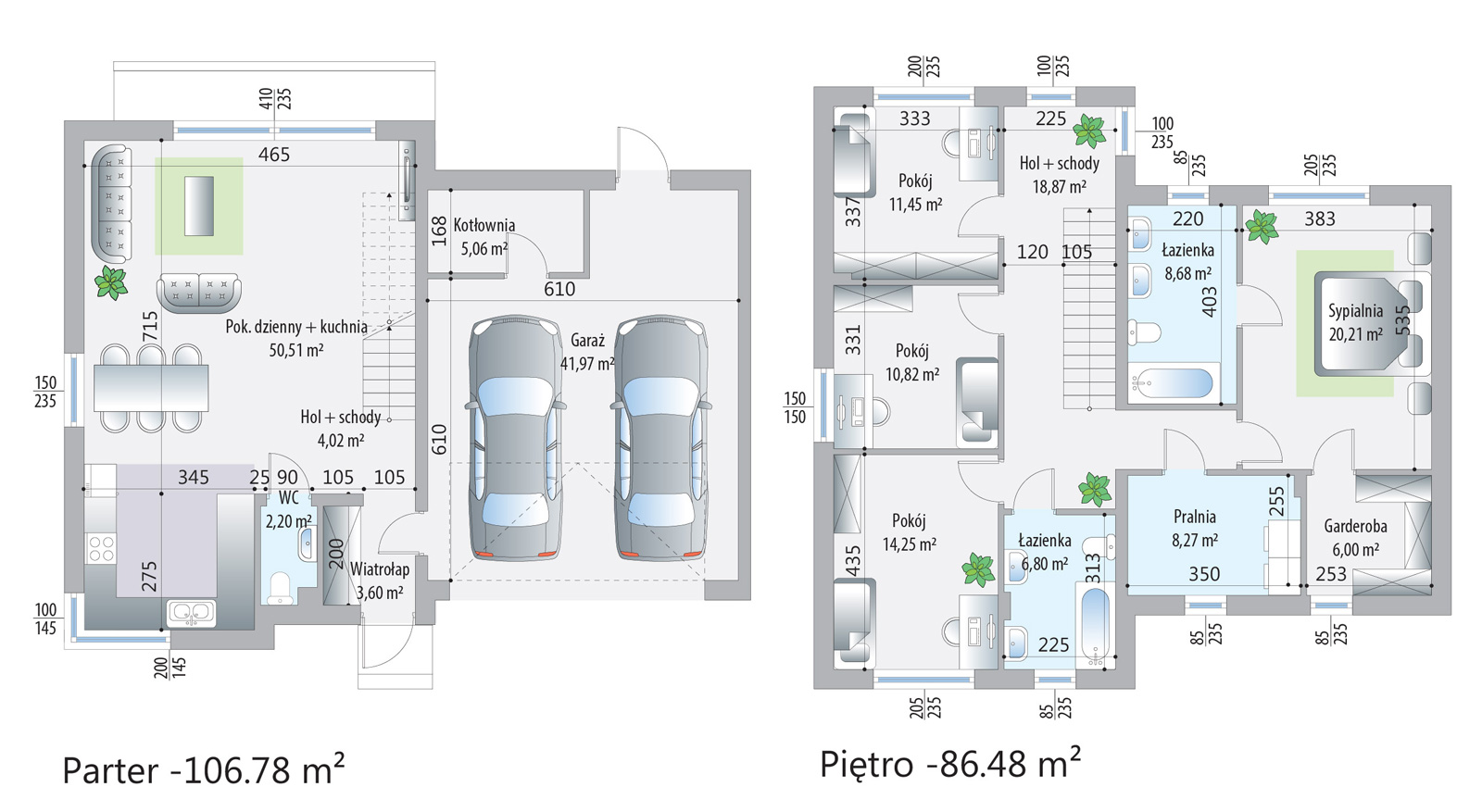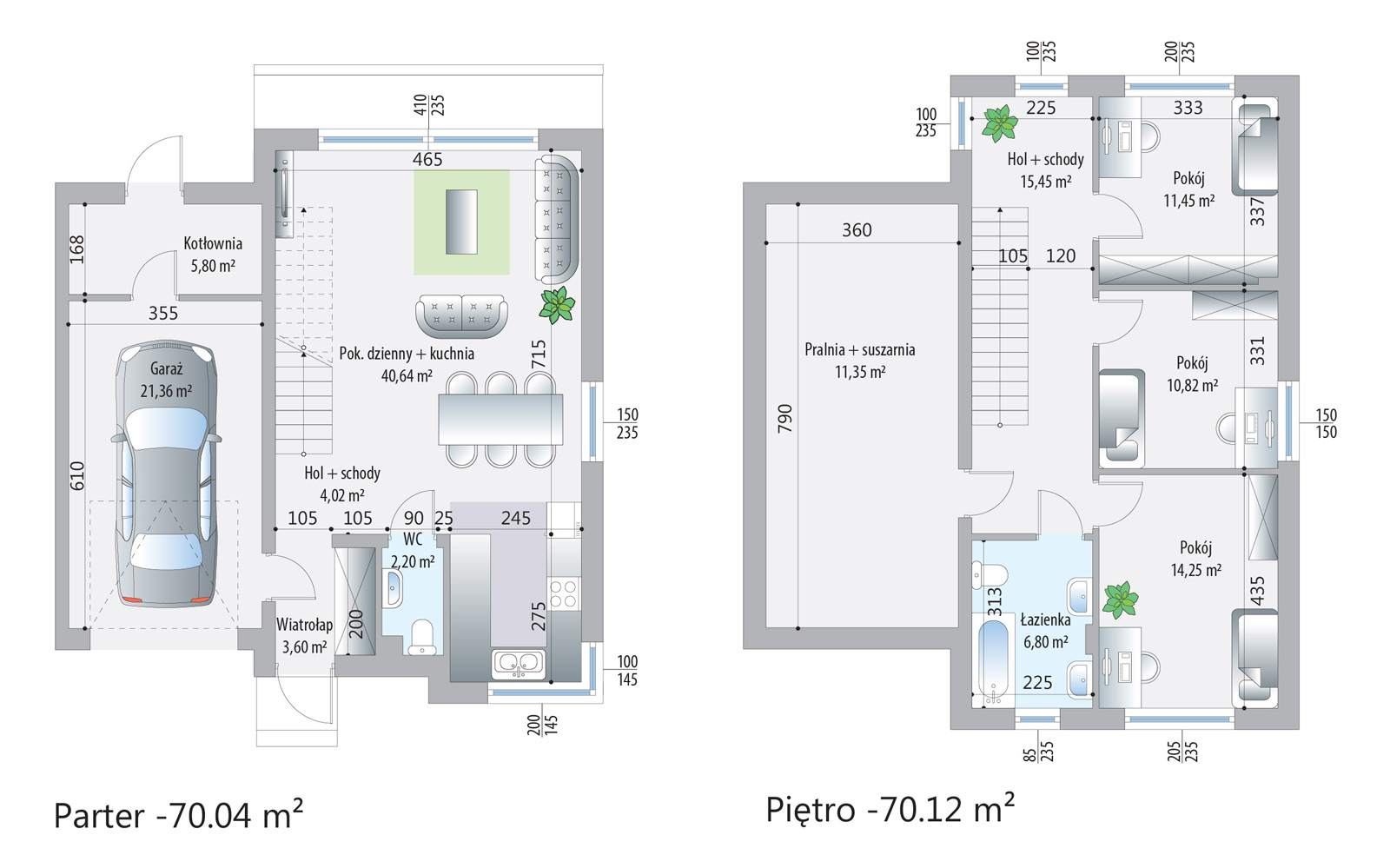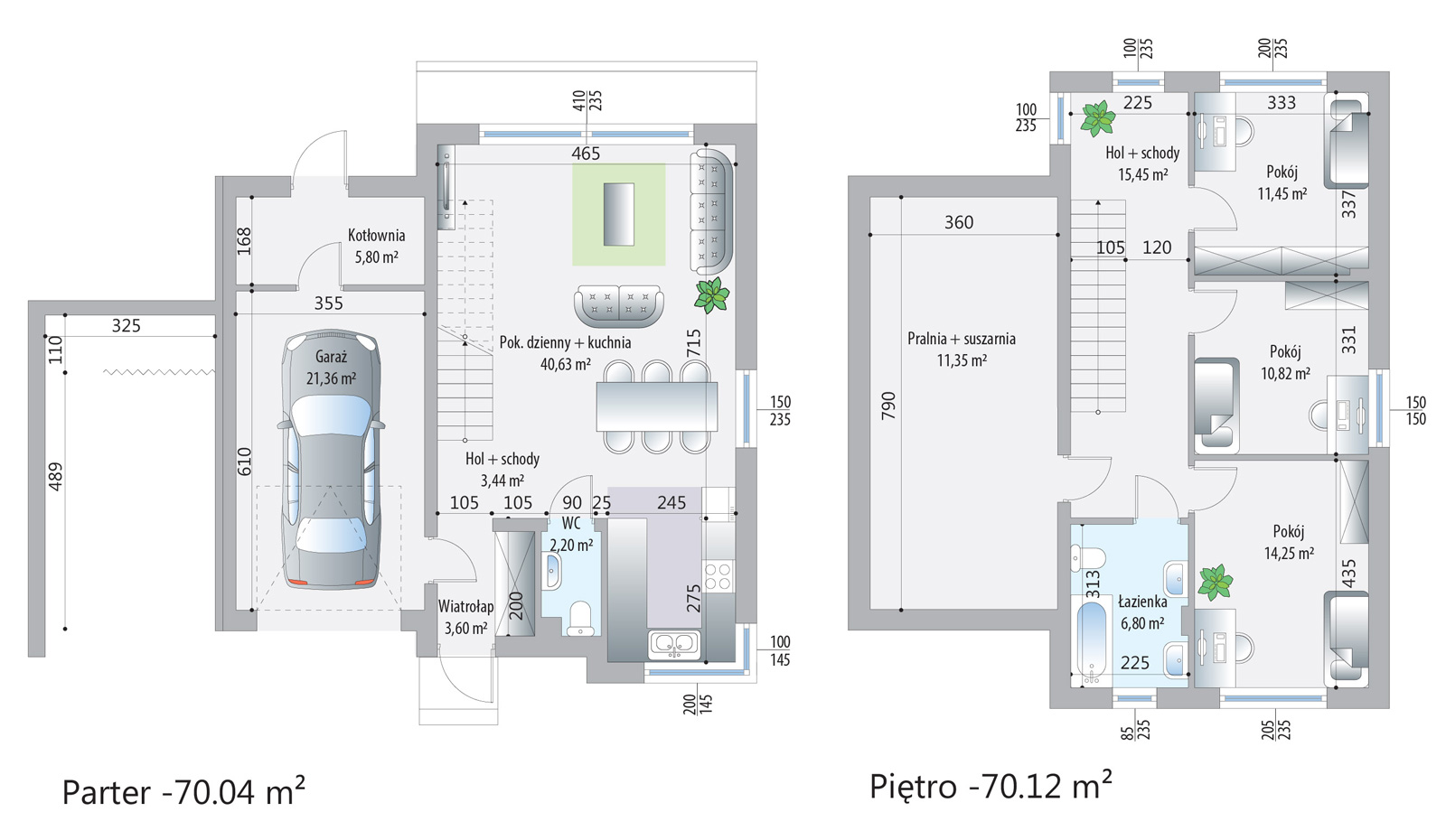Każdy dom w kompleksie został zaprojektowany z myślą o wysokim standardzie życia mieszkańców. Budynki są wyposażone w nowoczesne technologie, takie jak rekuperacja, która zapewnia świeże powietrze i oszczędność energii, oraz ogrzewanie podłogowe, które gwarantuje komfort cieplny. Panoramiczne okna wpuszczają dużą ilość naturalnego światła, co tworzy przyjemną i jasną atmosferę wewnątrz domów.